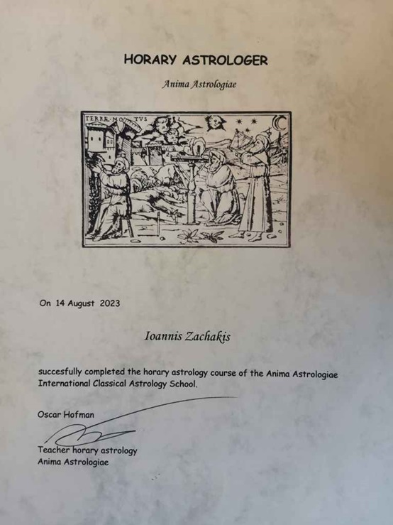 Without wasting any time, after successfully completing my training in Traditional Medical Astrology, I continued my astrological training in the art of Traditional Horary Astrology with the world-renowned astrologer and author Oscar Hofman (student of John Frawley). After getting my diploma as a Horary Astrologer – Anima Astrologiae, I continue my studies with Oscar Hofman in Natal and Electional Astrology.